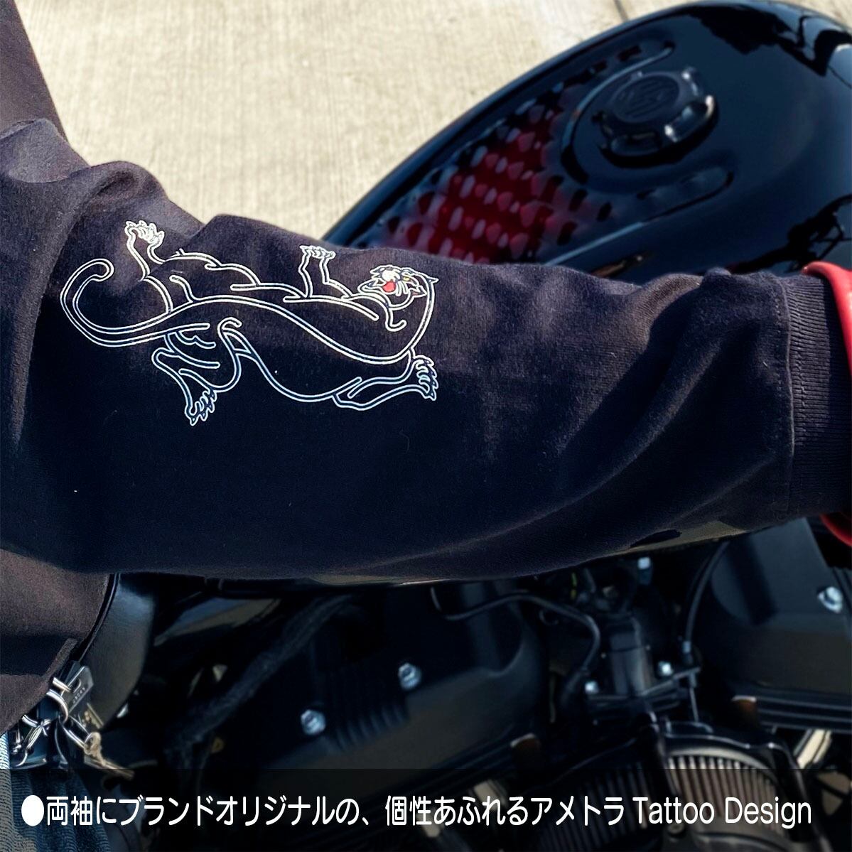 両袖にはパンサーの アメトラタトゥー デザイン がプリントされた メンズ ロンT です。